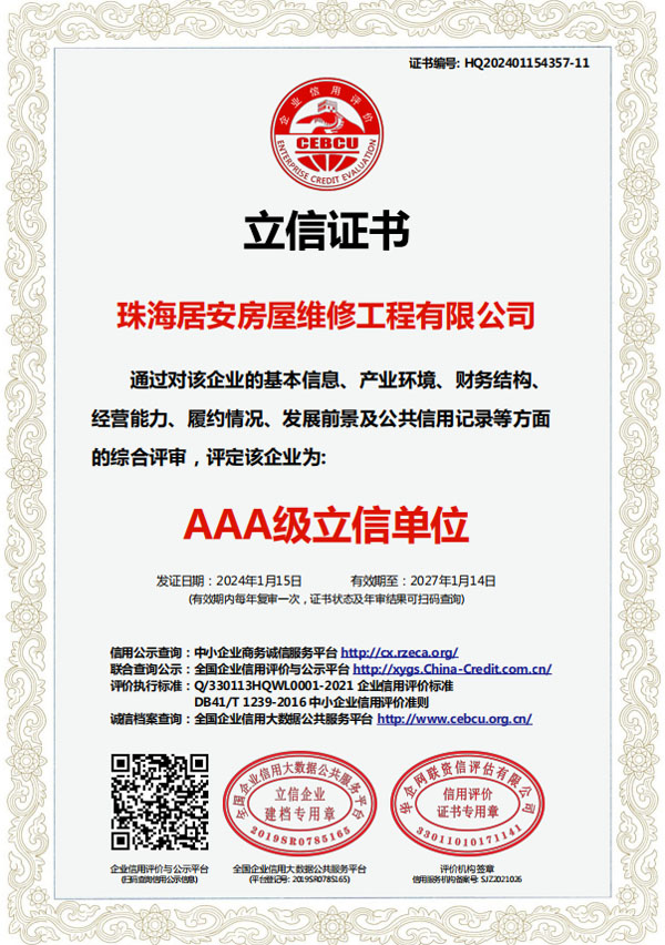 珠海居安房屋維修工程有限公司成立于2020年,是一家專(zhuān)注房屋維修的公司。我們擁有各類(lèi)型專(zhuān)業(yè)人才,業(yè)務(wù)包括老舊建筑翻新改造、外墻空鼓修復(fù)、防水幕墻養(yǎng)護(hù)、外墻預(yù)置構(gòu)件拆除更換、供排水管網(wǎng)改造、墻面翻新、鋼制結(jié)構(gòu)建筑構(gòu)建及折除,外墻清洗及裝修裝飾。 公司自成立以來(lái),始終堅(jiān)持以人為本、誠(chéng)信敬業(yè)的經(jīng)營(yíng)原則,與多家單位達(dá)成固定維修、養(yǎng)護(hù)清洗協(xié)儀,業(yè)務(wù)遍及廣州、東莞、中山、珠海等多個(gè)周邊城市。專(zhuān)業(yè)化團(tuán)隊(duì)尤其在墻面及窗邊防水工程業(yè)內(nèi)知名。…… >>> 更多內(nèi)容 |